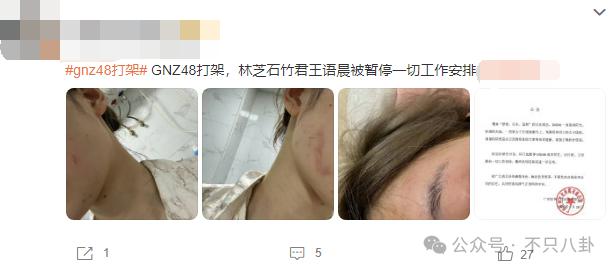 丝芭文化旗下的女子偶像团体 GNZ48 成员林芝、石竹君、王语晨因恋爱出轨暴力(互殴、扯头发)等争议被暂停工作 。