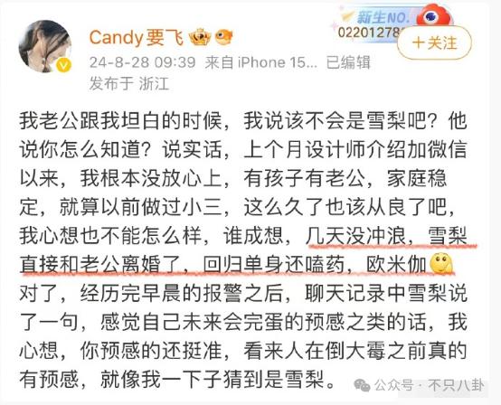 爆料人微博名叫【Candy 要飞】,这位女网友从 8 月 27 号开始,就在微博频频喊话雪梨(小号)。