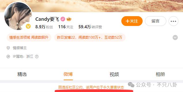 在微博发了一天疯的【Candy 要飞】账号直接被永久禁言 ↓