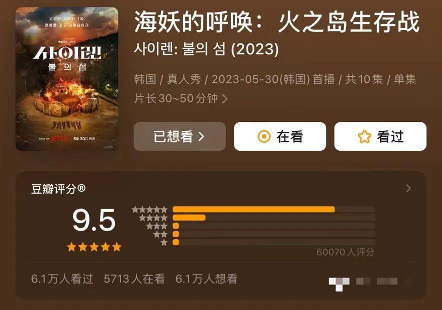 比如从韩国火过来的《海妖的呼唤》,六万豆瓣网友打出了9.5的高分。