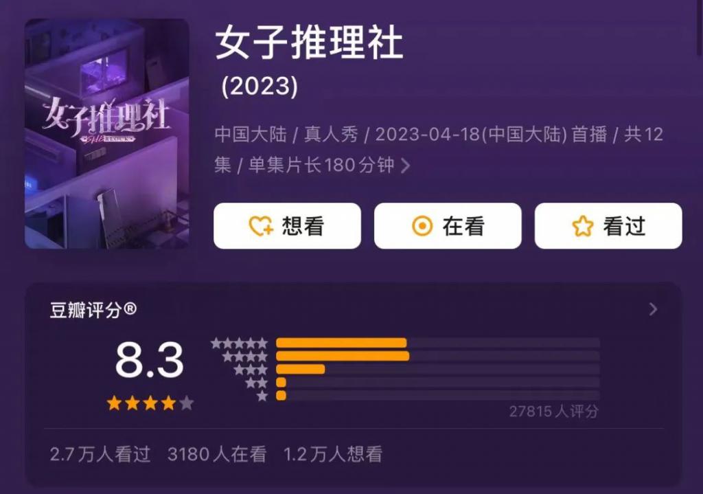 韩国的高分综艺《女高推理班》版权+芒果成熟的推理类综艺制作班底,虽然没有火出圈,但节目质量还算稳定发挥,口碑不错。