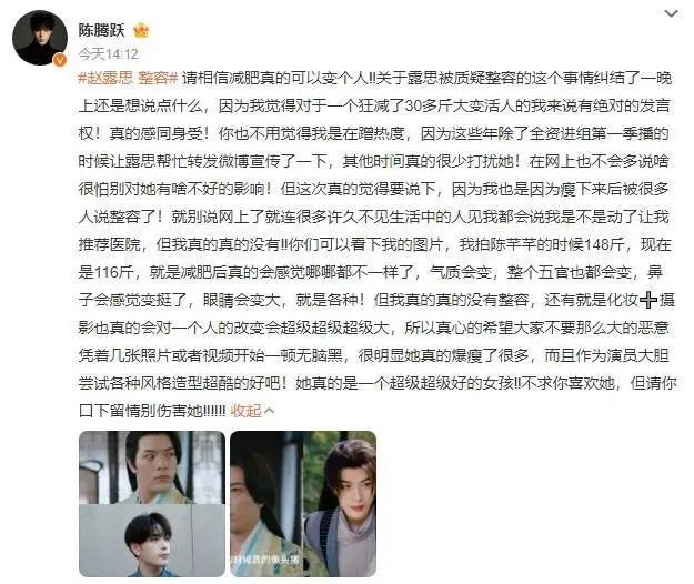 近日,赵露思被质疑整容引发热议。9 月 7 日,曾和赵露思合作过《传闻中的陈芊芊》的男演员陈腾跃在社交平台发文力挺赵露思。他晒出自己减肥前后的对比图力证减肥真的可以变个人,并表示:" 赵露思很明显她真的爆瘦了很多,且大胆尝试各种风格造型超酷的,她真的是一个超级超级好的女孩!不求你喜欢她,但请你口下留情别伤害她!"