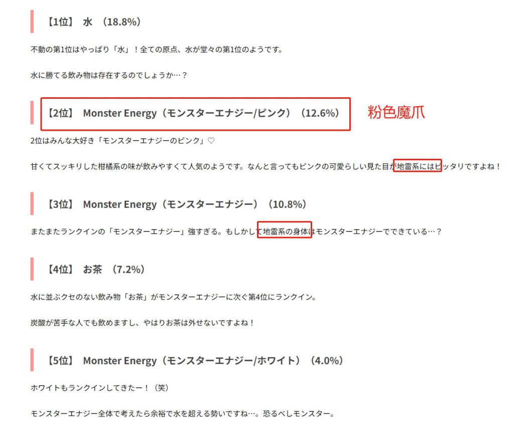 在日本网络论坛上曾有一个地雷系调研,让地雷系男女们投出自己最爱喝的饮料排行,前五位,魔爪占了三席位,分别是粉魔爪(12.6%)、原味魔爪(10.8%)、白魔爪(4%),剩下的竞争对手只有水和茶了。