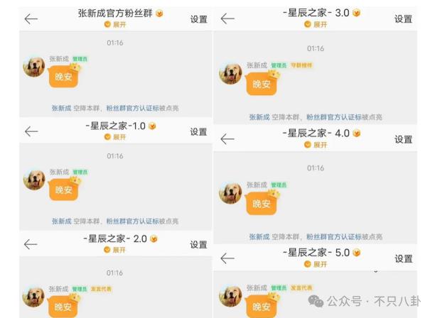 接着张新成本人连续空降 6 个粉丝群,在每个群里都和粉丝道了晚安 …… 但绝口不提恋爱相关的事