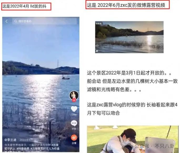 除此之外,疑似还有更早的互动:李兰迪 2022 年 4 月曾晒出一则视频,视频中湖水、山峦和张新成在 2022 年 6 月晒出的露营视频是同一地点。
