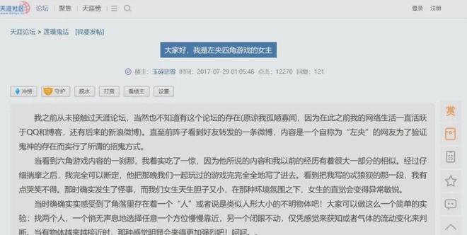 一个名叫左央的网友在天涯论坛上发表的帖子,声称要亲身尝试各种网络上流传的招鬼游戏,并实时在网上更新验证结果。