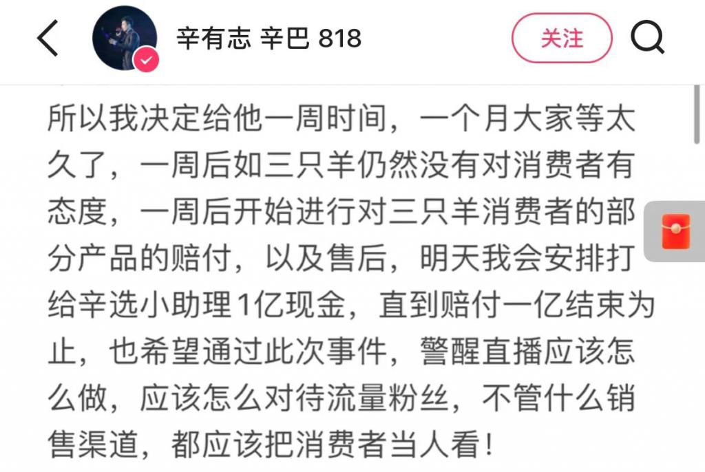 或许是观察到舆论难得对自己有利,9 月 4 日晚,辛巴发布公告乘胜追击。首先,禁止辛选旗下直播间再带货大闸蟹品类,从而避免外界说他 " 蹭流量 "。其次,祭出真正的 " 杀招 " ——给小杨哥一周的时间,如果 " 仍然没有对消费者有态度 ",辛巴会自掏腰包 1 亿元替小杨哥给消费者赔付。