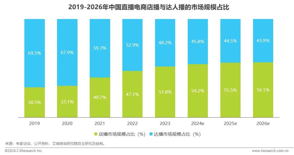 仅存的增量与超头主播的关系也有限,直播带货内部尚在增长的领域是品牌店播,属于腰部及以下区间。据艾瑞咨询发布的《2023 年中国直播电商行业研究报告》,店播的市场规模占比已经超过了五成,达到了 51.8%。头部主播能分到的肉已经越来越少了。