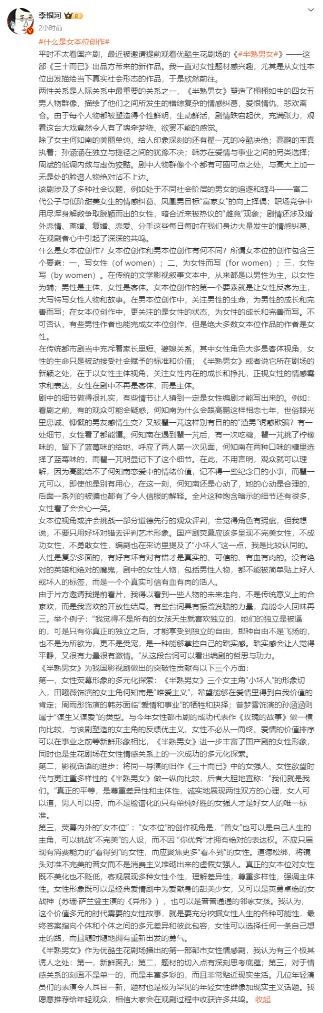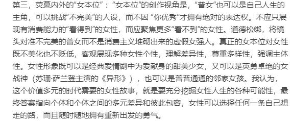 甚少关注内娱电视剧的李银河在长文中写到生花剧场通过这部都市剧集做到了 " 女本位 " 的表达,让女性荧幕形象有了更为多元化的探索,也大方展现了女欲望时代不同个体的差异化,在某种程度上完成了影视话语的进步。