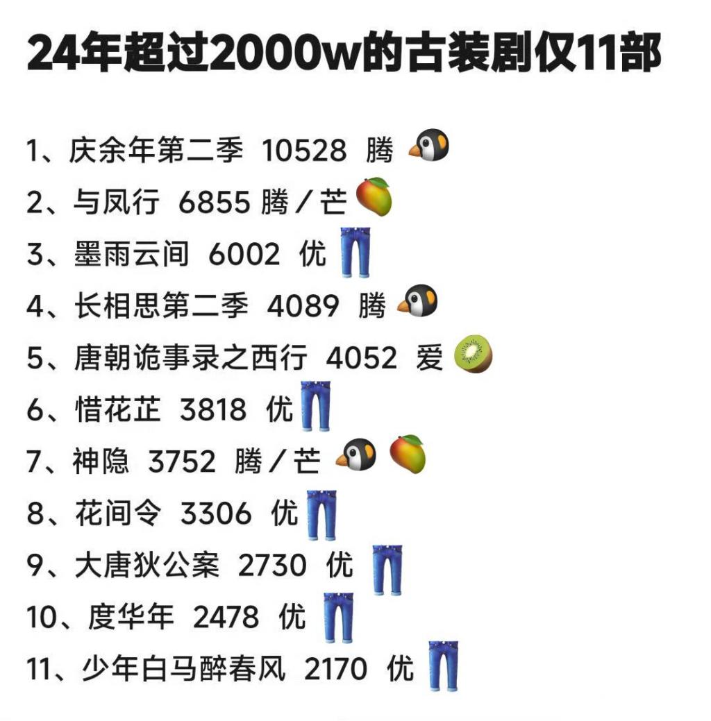 所谓的升级并不只是虚设,生花剧场在女频剧的深耕精作已经有了更深层次的精耕细作,这些剧集就是剧圈的垂类细化后成绩也有了回报,2024 上半年共有 11 部古装剧集均观看突破 2000 万,其中生花剧场的《墨雨云间》、《惜花芷》、《花间令》、《度华年》就占据了四席。