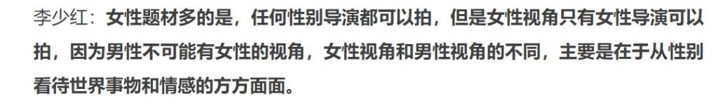 导演李少红就曾经对媒体直言女性视角和男性视角的不同,主要在于从性别看待事物和情感的方方面面都存在差异。