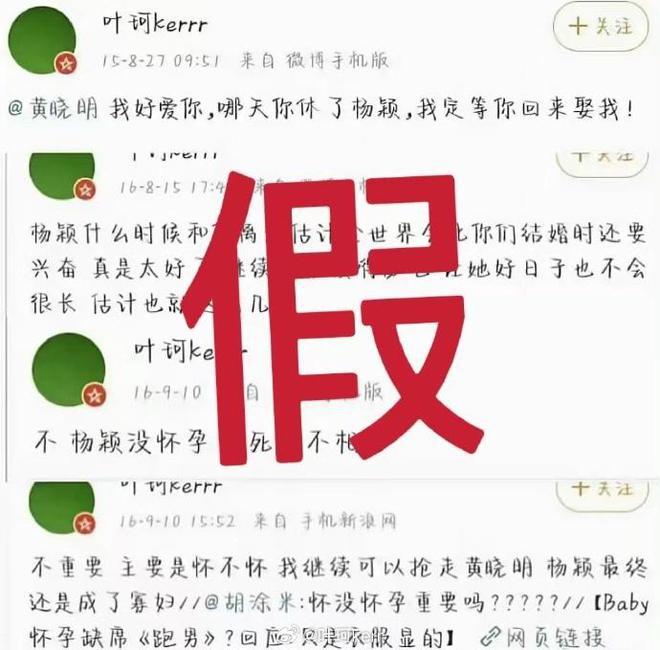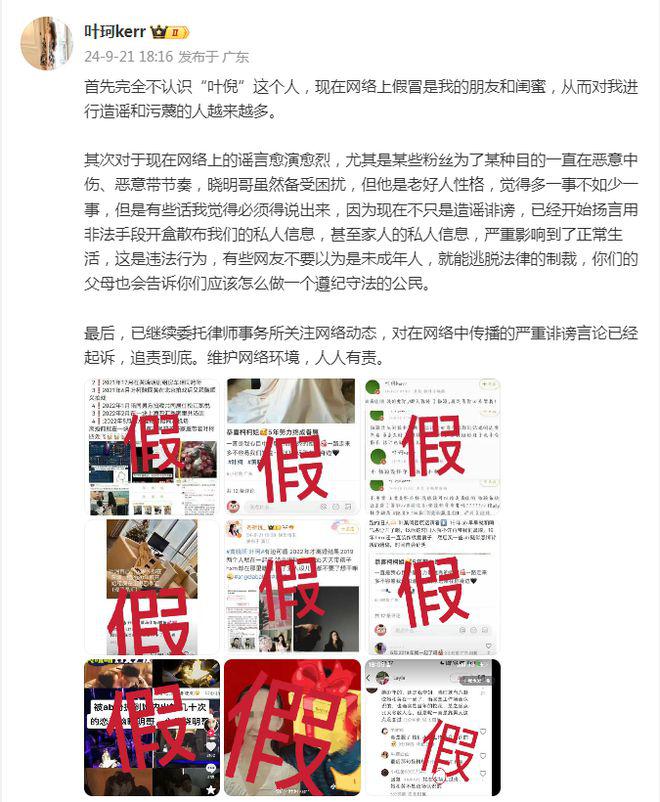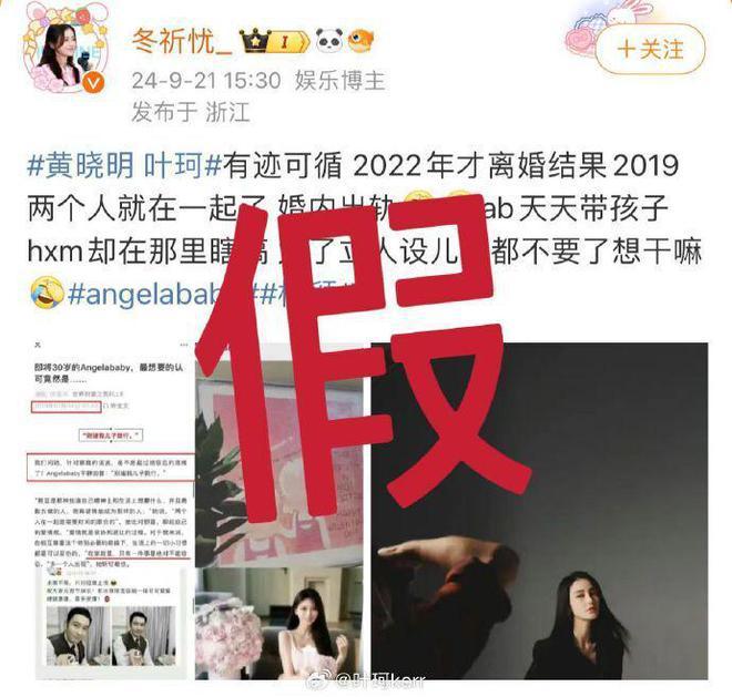9 月 21 日傍晚,黄晓明的女友叶珂也突然在个人的社交平台上发文,并且晒出了九宫格的图片,上面也均一色的打上了一个超大的 " 假 " 字,还表明了自己已经采用了法律的武器,维护自身的合法权益,看得出来她也已经特别的愤怒了。