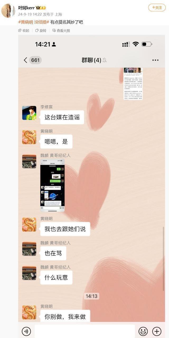 而让人意想不到的是叶珂并不是转发黄晓明的官宣文案,反而是晒出了几人的聊天记录截图,表明立场。从聊天记录截图中也可以看到黄晓明依旧是一副霸道的语气,称台媒报道的黄晓明和叶珂没结婚是造谣,那意思就是他们两人其实也已经结婚了。