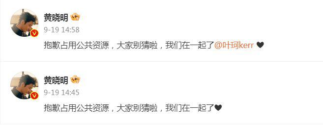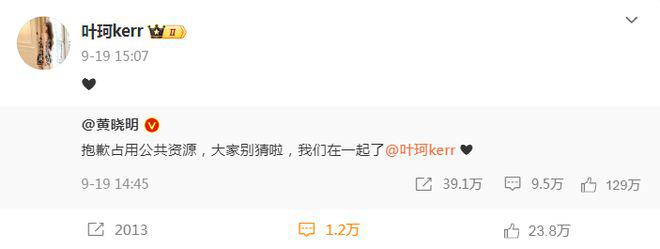 我们也都知道黄晓明也叶珂其实也已经相恋许久了,多次被拍到了同框的画面。直到 9 月 19 日下午,黄晓明也突然在个人的社交平台上发文官宣了恋情:" 抱歉占用公共资源,大家别猜啦,我们在一起了 "。而他一开始并没有艾特女友,经过编辑之后才重新发布,看样子是在十分仓促的情况下官宣的。