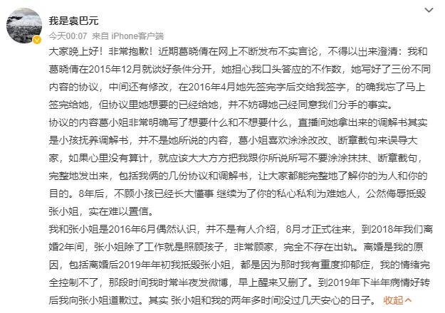 9 月 21 日凌晨,袁巴元在社交媒体上发文,回应了与葛晓倩的分手细节,他指出两人在 2015 年 12 月就已经谈好条件分开,并且葛晓倩写好了三份不同内容的协议。袁巴元还提到,葛晓倩在直播间展示的调解书实际上是关于孩子抚养的调解书,并非她所声称的内容,并指责葛晓倩涂改、断章取义误导公众。