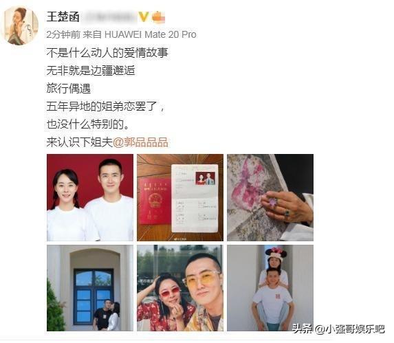 从微博中看到的好像王珞丹姐姐王楚涵和郭金让都在各自的账户上发出来结婚证照片并配上图片,还有两个人甜蜜的合照。王楚函说:“不是什么动人的爱情故事,无非就是边疆邂逅,旅行偶遇。五年异地的姐弟恋罢了,也没什么特别的。来认识下姐夫”!