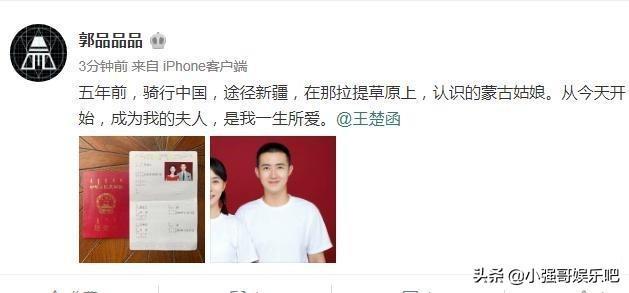 郭金让也在微博上晒出证件和照片附文说道:“五年前,骑行中国,途径新疆,在那拉提草原上,认识的蒙古姑娘。从今天开始,成为我的夫人,是我一生所爱。”