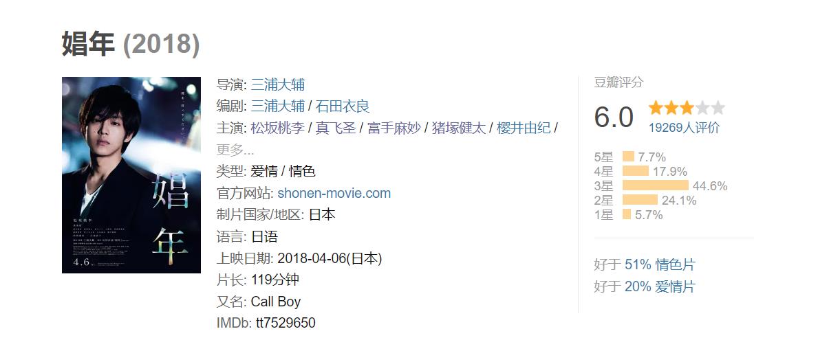《娼年》是由日本富士电视台、Horipro、共同电视台联合制作,东宝映画发行的119分钟情色影片。该片由三浦大辅编剧、执导,松坂桃李、真飞圣主演,于2018年4月6日在日本上映,该剧本改编自石田井良的同名情色言情小说,该小说于2001年获得直木奖提名,在2016年8月改编舞台前获得女性读者的广泛关注和支持。该剧每场演出都售罄,因此引起了广泛关注。现在,同样的三浦松坂二人组通过将故事搬上银幕,迎接了更严峻的挑战。讲述了大学中途退学,在酒吧打工,浑浑噩噩地过着日子的森中领,在偶然中成为“牛郎”,逐渐通过“牛郎”的工作发觉到女性心中隐藏的欲望后,慢慢被吸引。