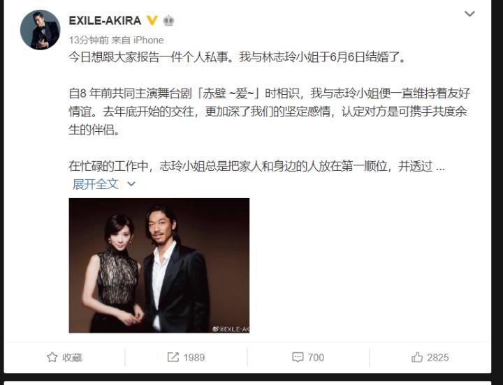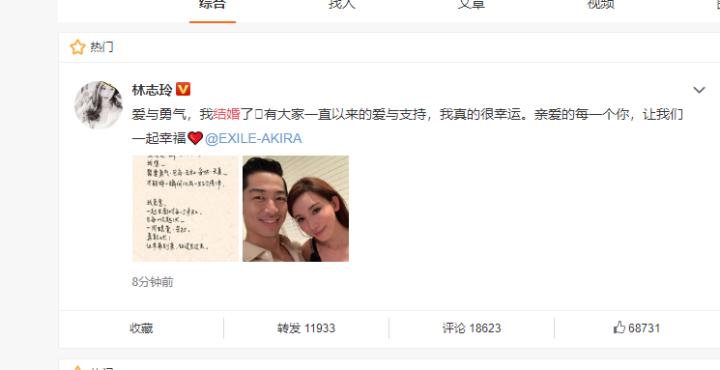 今天19:07,林志玲在自己的官方微博发文称:“爱与勇气,我结婚了!有大家一直以来的爱与支持,我真的很幸运。”对方是日本男子组合EXILE成员。