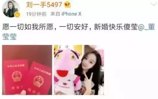 刘一手微博晒出与女友的结婚证,两人终于修成正果。
