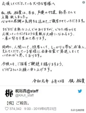 日本知名声优梶裕贵与竹达彩奈在今日正式宣布结婚,两人在社交平台上发文公布了婚讯。