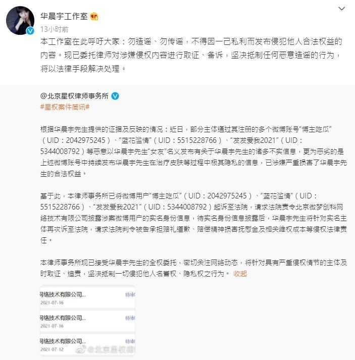 面对网友的恶意造谣,华晨宇工作室态度强硬的发出声明表示,「本工作室在此呼吁大家:勿造谣、勿传谣,不得因一己私利而发布侵犯他人合法权益的内容。现已委托律师对涉嫌侵权内容进行取证、备诉,坚决抵制任何恶意造谣的行为,将以法律手段解决处理。」而再度无辜遭波及的张碧晨也于16日委托律师护权,坚决扞卫己方权益,不再姑息恶意指控。