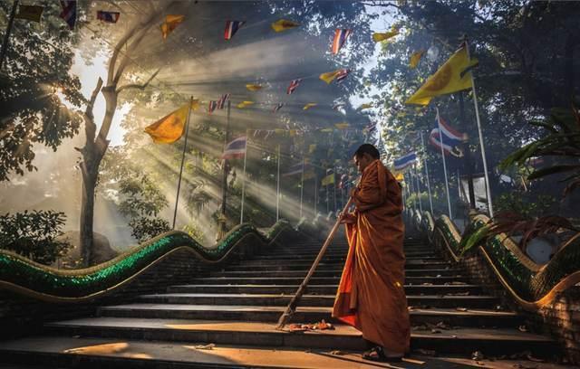 一个身穿青袍的枯瘦僧人拿着一把扫帚,正在弓身扫地。这僧人年纪不少,稀稀疏疏的几根长须已然全白。