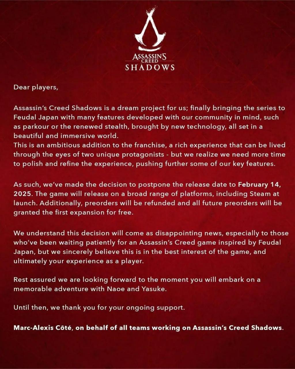 果然到 9 月 25 日深夜,《刺客信条:影》项目组发公告,宣布游戏将推迟到 2025 年 2 月 14 日发售,届时也会首发登陆 Steam,为目前的预购订单提供退款,未来预购的玩家可免费获得第一个拓展包。