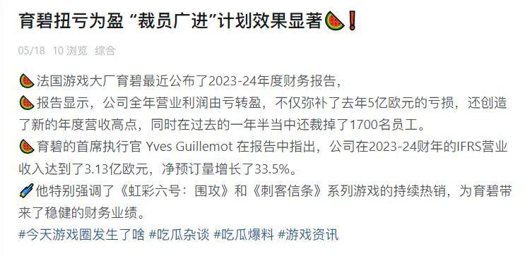 2023 财年,育碧号称创造了创纪录的公司营收,但被玩家社区锐评是吃老本,财报里解释的亮点是上线了九年的《彩虹六号》表现强劲,而且整体业绩转亏为盈,代价是裁了 1700 个员工。