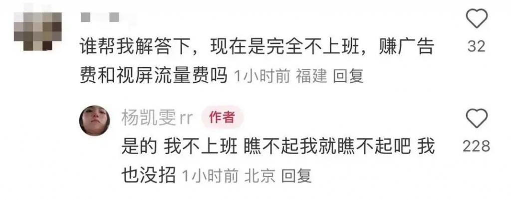 得到了杨凯雯的回应:是的,我不上班,瞧不起我就瞧不起我吧。