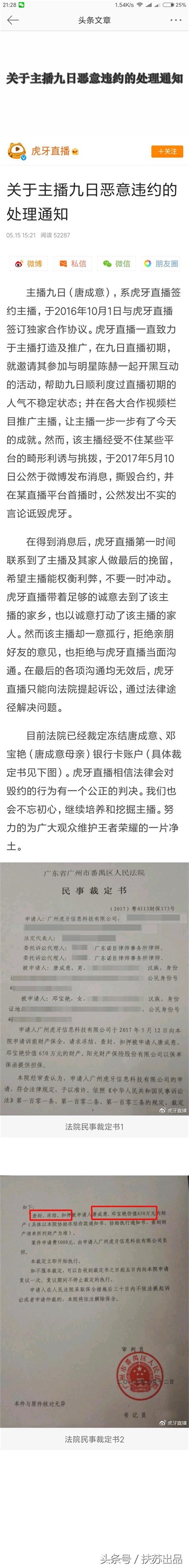 《扶苏》关于王者荣耀虎牙主播九日一事,虎牙官方微博发出通告