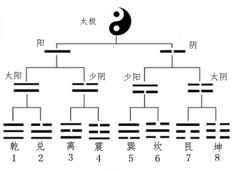 意思是:太极生阳阴,阳阴生四象(太阳、少阴、少阳、太阴),四象生八卦(乾、兑、离、震、巽、坎、艮、坤)。如下图所示,阳为一长横,阴为两短横。四象是在阳的基础上分别加了一阳一阴,也就是在阳的基础上分别再加一长横两短横(同样在阴的基础上分别加了一长横两短横),这样就形成四象。然后继续将四象之上分别再加一阳一阴,即成八卦。(就是数学的排列组合)