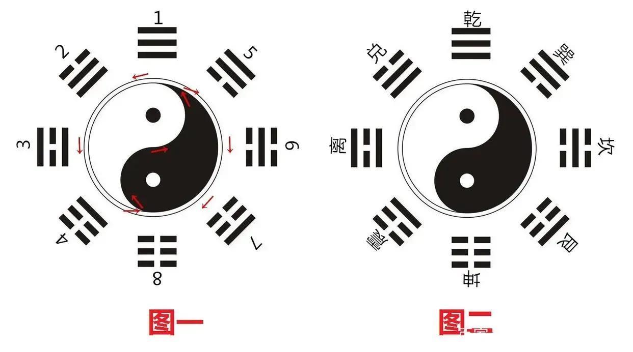 从下图一,你根据箭头所指的路线,就能一笔画出圆形太极来。然后将数字1乾2兑3离4震5巽6坎7艮8坤所对应的挂,按箭头指示的顺序排列,就能形成了图二。