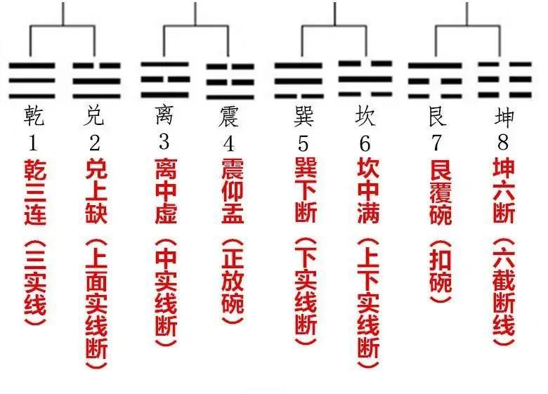 知道了八卦的生成,接着就是画法口诀,首先你得先记住8个字的顺序:1乾2兑3离4震5巽6坎7艮8坤,下面是口诀,如果你已经看懂上图(八卦的形成),这口诀根本就不用记了“乾三连、坤六断、震仰盂、艮覆碗、离中虚、坎中满、兑上缺、巽下断”(讲解如下图)。