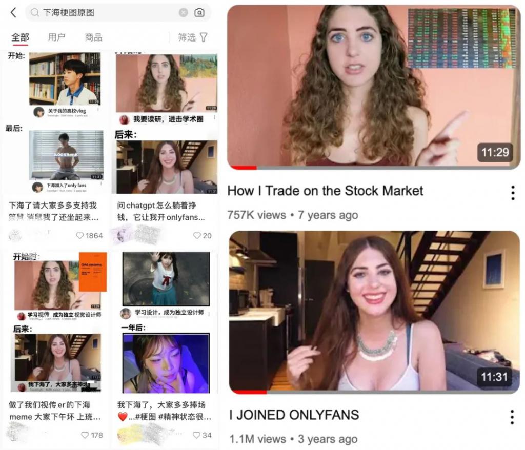 这类梗图最初来源于 YouTube 一位旅行博主 Jordan Taylor。从七年前分享如何炒股赚钱,到三年前说自己加入了 OnlyFans,(点击阅读:百亿 OnlyFans 背后:欲望如何成为一门生意),虽然她在宣布加入 OnlyFans 时称自己会继续发布旅行视频,但该账号并未再更新。