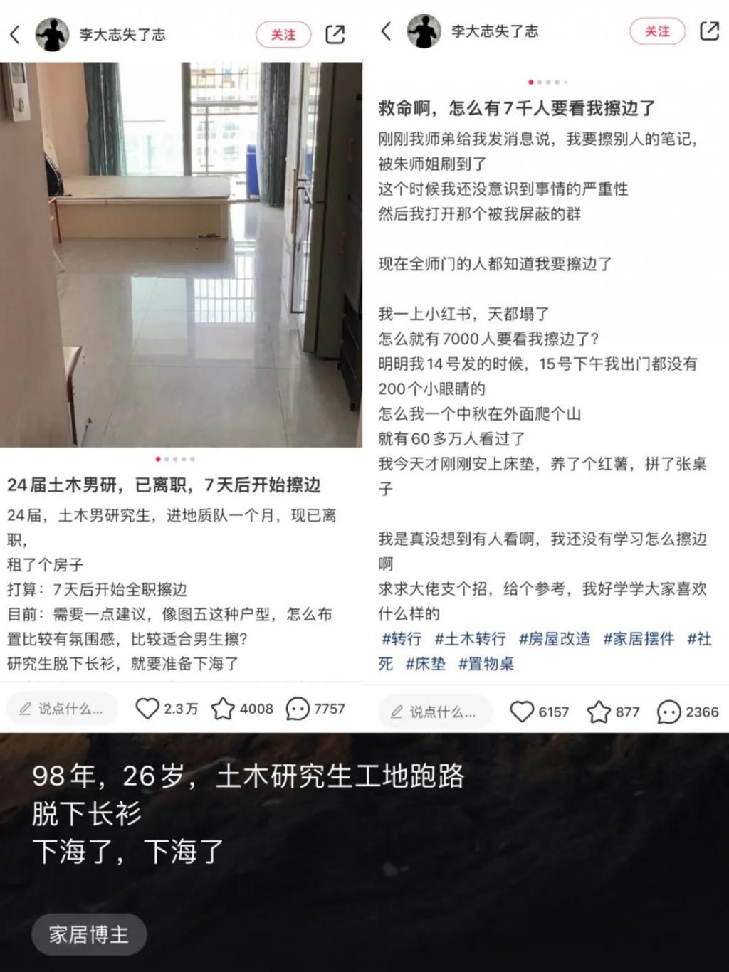 9 月 14 日,小红书博主 @李大志失了志发了第一篇贴子,"24 届土木男研,已离职,7 天后开始擦边 "。