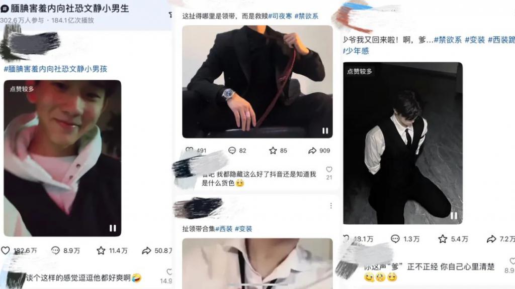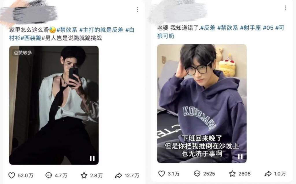 为自己立人设也是一种通用法则。霸总、禁欲系、爹系男友等标签层出不穷,在这些擦边博主的视频里少不了西装跪、扯领带、戴锁链。而 # 腼腆害羞内向社恐文静小男生 ## 社恐 18X 腼腆有腹肌 # 的 tag 下,一个个则是清纯男大、弟感爆棚;还有人通过视频前后的反差对比,营造可狼可奶的双重人设。
