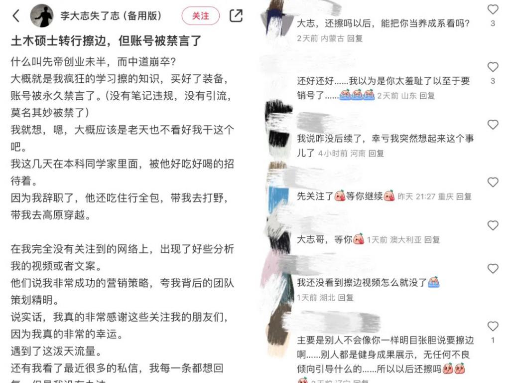 "24 届土木男研,已离职,7 天后开始擦边 ",小红书博主 @李大志失了志的一篇擦边预告贴一周涨粉 1w,点赞 2.2w,暴力起号的方式令网友直呼 " 太猛了 "。