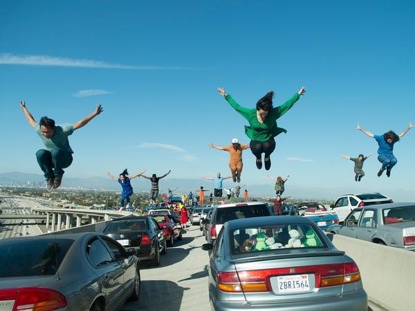 影片开头就是一段有些超现实的歌舞桥段:一群心怀梦想的年轻人,不无象征意义地堵在了前往洛杉矶的高速公路上,纷纷走出车门,载歌载舞。