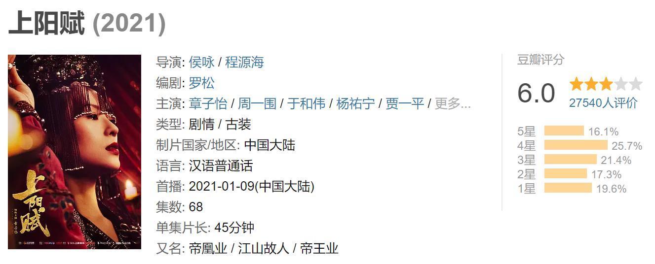 按照拍摄时间线来说,《上阳赋》也是前两年拍摄的电视剧,刚好和《如懿传》《天盛长歌》《大明风华》是同一批,只是其中经历了各种延期改名,最终在2021年播出。这就和那两年电影咖扎堆拍电视剧的风潮连上了,而那些先播的剧集除了少数口碑翻转,多数是被嘲居多。只能说章子怡最终也未能逃脱这个定律,《上阳赋》晚了几年该面对的还是得面对。