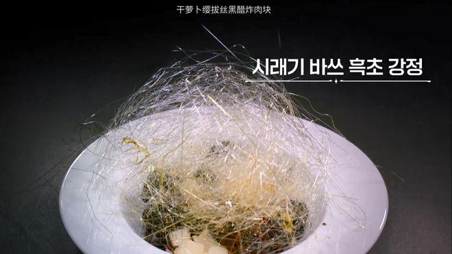 再用酸口的酱炒一下,最后与铺在上面的糖丝,共同形成糖醋风味的料理。
