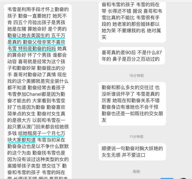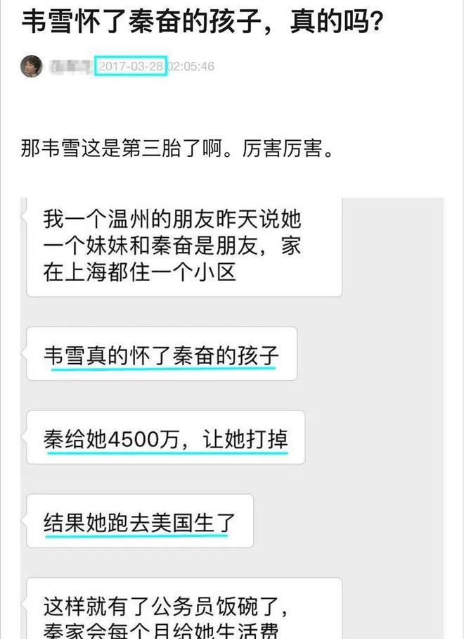 这之后相关的消息越来越多,还有人声称因为怀了孕,男方谈过要给她 4500 万作为打掉的赔偿,但韦雪没要,而是跑到美国去生产了。