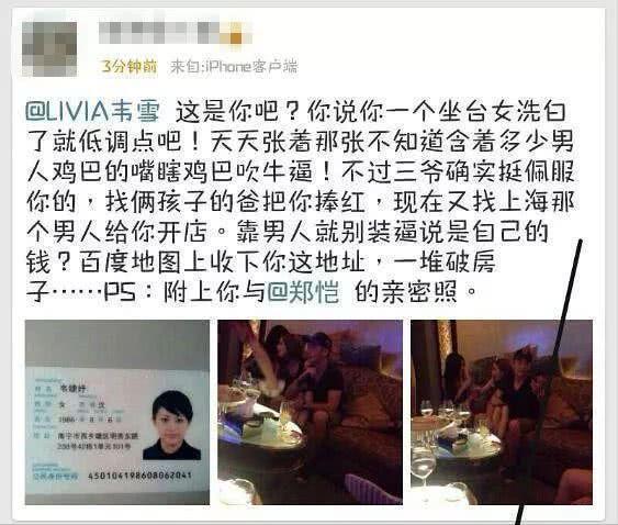 随着爆料大军的增加,还有网友直接甩出韦雪的身份证照片,并说她年龄造假,以及其不堪的发家史:" 找俩孩子的爸把你捧红,又找上海男人给你开店,靠男人就别说是自己的钱!"