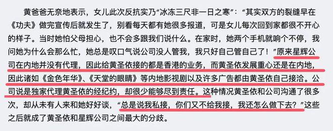 当时黄圣依的爸爸就吐槽,星辉主要业务在香港,很多内地的工作找上黄圣依都不能及时推进,言语间就是公司耽误自家娃了。