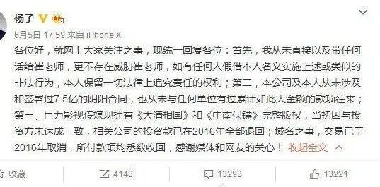 巨力影视在 2016 年投资了两部电影《大清相国》和《中南保镖》,杨子分别担任导演和编剧,然而这两部电影却在 2018 年卷入阴阳合同风波。背靠的巨力索具状况也不复当年。