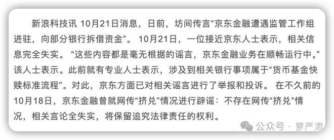 后来网传称京东金融出现挤兑遭遇监管进驻甚至需要拆借资金。京东辟谣称完全失实。