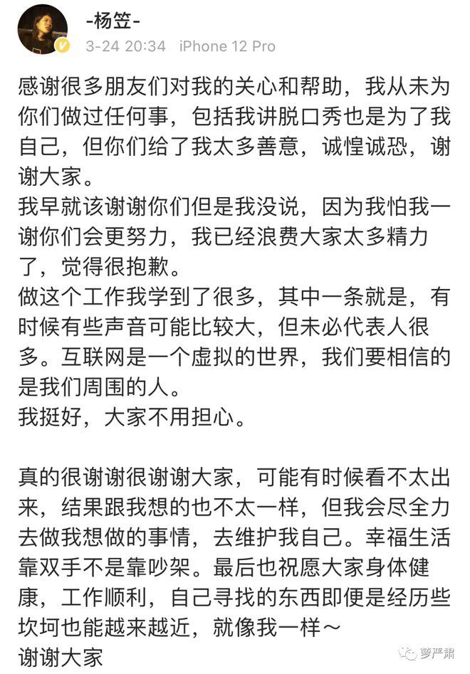 就因为这样含糊不清,到了杨笠晚上出现在直播间那一刻,大家的心才算是落了地。当时连保护杨笠的卫生巾商务都要这么提心吊胆。