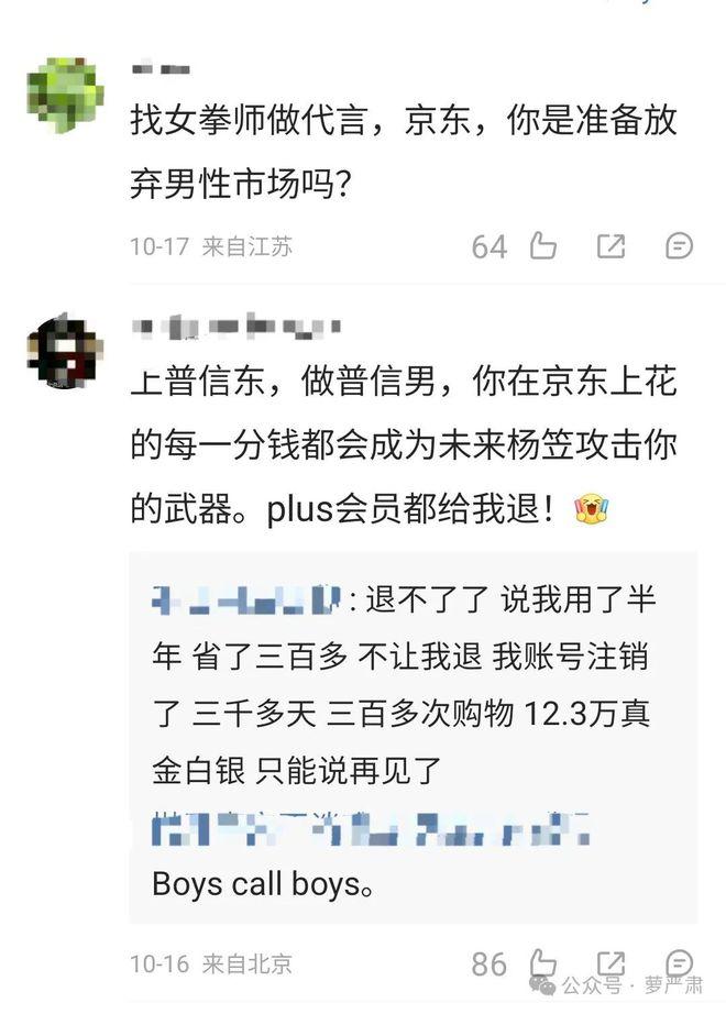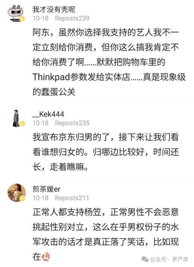 有男的欢庆京东取消了杨笠的合作,就会有女性因为支持杨笠也退订京东会员,并从此以后把京东视作一个厌女企业。