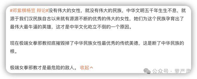 回顾一下杨笠邓紫棋的讨论,起因是《同一屋檐下》里男嘉宾总说 " 我是为了你奋斗 ",但这种态度生活里带来的就是女性为男性提供后援和情绪支持,男性奋斗真正有利的是自己的人生和事业。杨笠说:" 男生的精力就就这么一点是吗,奋斗用多大劲?"