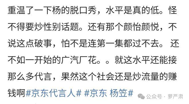 杨笠有个京东商务忽然又被撤换已经是上周的事情了。当时没有立刻写,其实有个原因是,就杨笠被抵制被黑这些,前几年已经至少写了四次 …… 也三四年过去了,怎么舆情一点没好转,感觉破防男还又变多了啊!